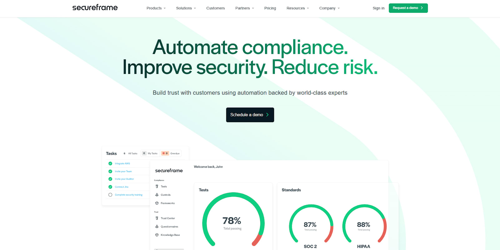 Secureframe offers a balanced option for teams early in their scaling phase. I found the platform combines tooling with structured onboarding and provides audit readiness workflows designed to guide teams through initial compliance setup. Secureframe supports multiple frameworks and provides tools for managing security questionnaires and vendor assessments.